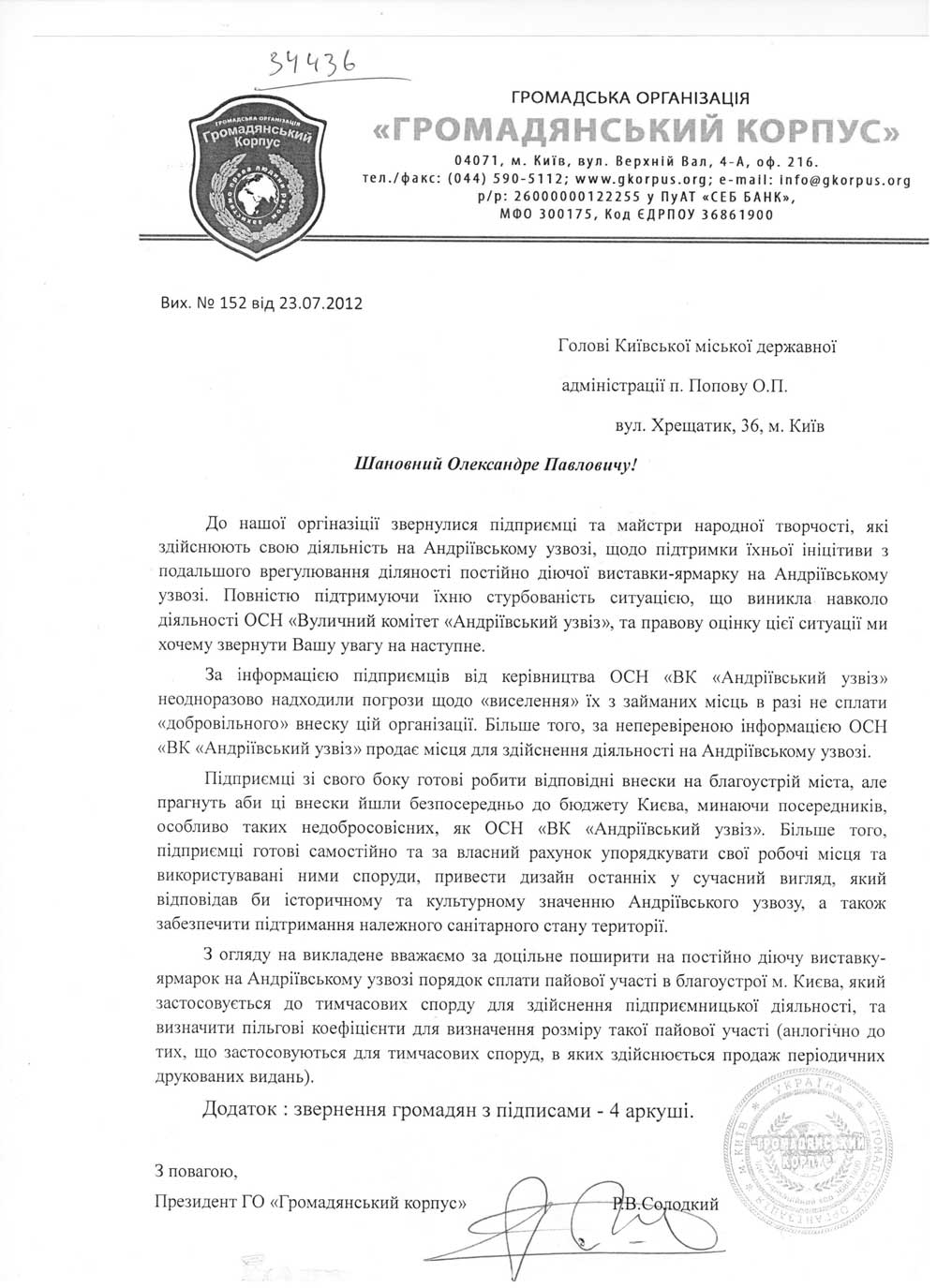 Підтримуючи підприємців та майстрів народної творчості з Андріївського узвозу, «Громадянський Корпус» підготував і направив листа голові Київської міської держадміністрації Олександру Попову з пропозицією переглянути розпорядження КМДА від 23.05.12 р. №850 «Про організацію постійно діючої виставки-ярмарку на Андріївському узвозі» з метою позбавлення ОСН ВК «Андріївський узвіз» повноважень в питаннях організації постійно діючої виставки-ярмарку на Андріївському узвозі та передачі відповідних повноважень Подільській районній у місті Києві державній адміністрації або її підрозділам чи відповідним комунальним підприємствам.