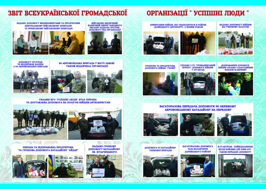 Всеукраїнська громадська організація «Успішні люди» надала звіт за півроку своєї діяльності щодо реалізації проекту «Допомога переселенцям та учасникам АТО». Звіт був розповсюджений серед мешканців на території Дарницького району.